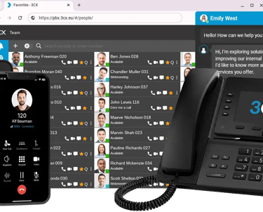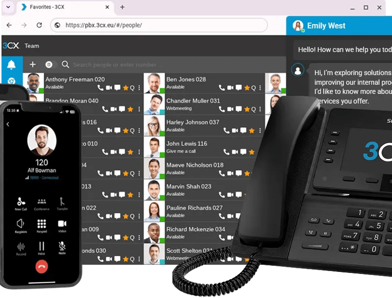 O 3CX é um sistema telefônico empresarial hospedado na nuvem ou autogerenciado que permite que você mantenha o controle de seus próprios troncos e números. É uma plataforma de comunicação completa, eliminando os custos e as dores de cabeça de gerenciar vários sistemas.